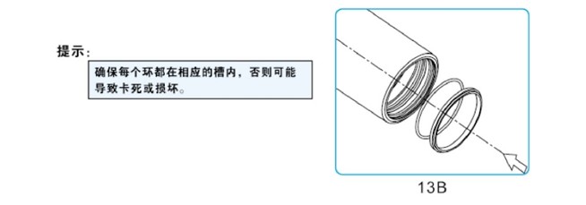 由導向帶開始,然后是油封和 O 型圈、防塵圈,切勿把油封裝反有油封溝槽的一面朝缸筒里側裝完油封和 O 型圈、防塵圈。